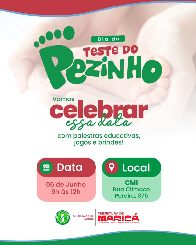 A equipe do CEMPES, em parceria com a Secretaria de Saúde de Maricá, convida toda a comunidade para um evento especial em comemoração ao Dia Nacional do Teste do Pezinho, com foco em informação, cuidado e acolhimento!